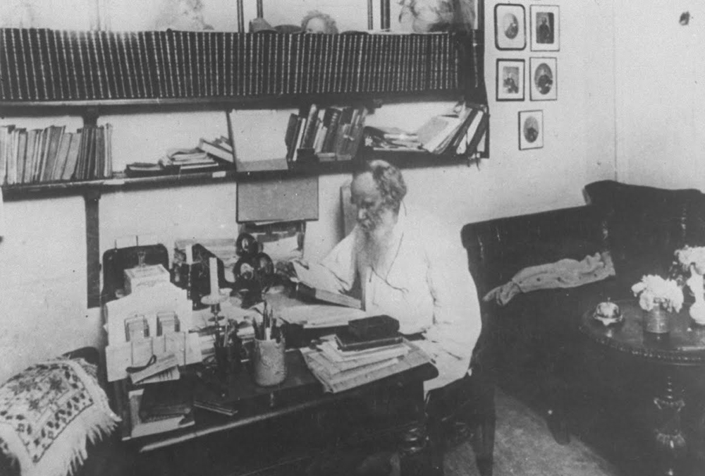 According to Sergei, Tolstoy worked in isolation—no one was allowed to enter his study, and the doors to the adjoining rooms were locked to ensure that he would not be interrupted. (An account by Tolstoy’s daughter Tatyana disagrees on this point—she remembers that their mother was allowed in the study; she would sit on the divan sewing quietly while her husband wrote.) Before dinner, Tolstoy would go for a walk or a ride, often to supervise some work on the estate grounds. Afterward, he rejoined the family in a much more sociable mood. Sergei writes: